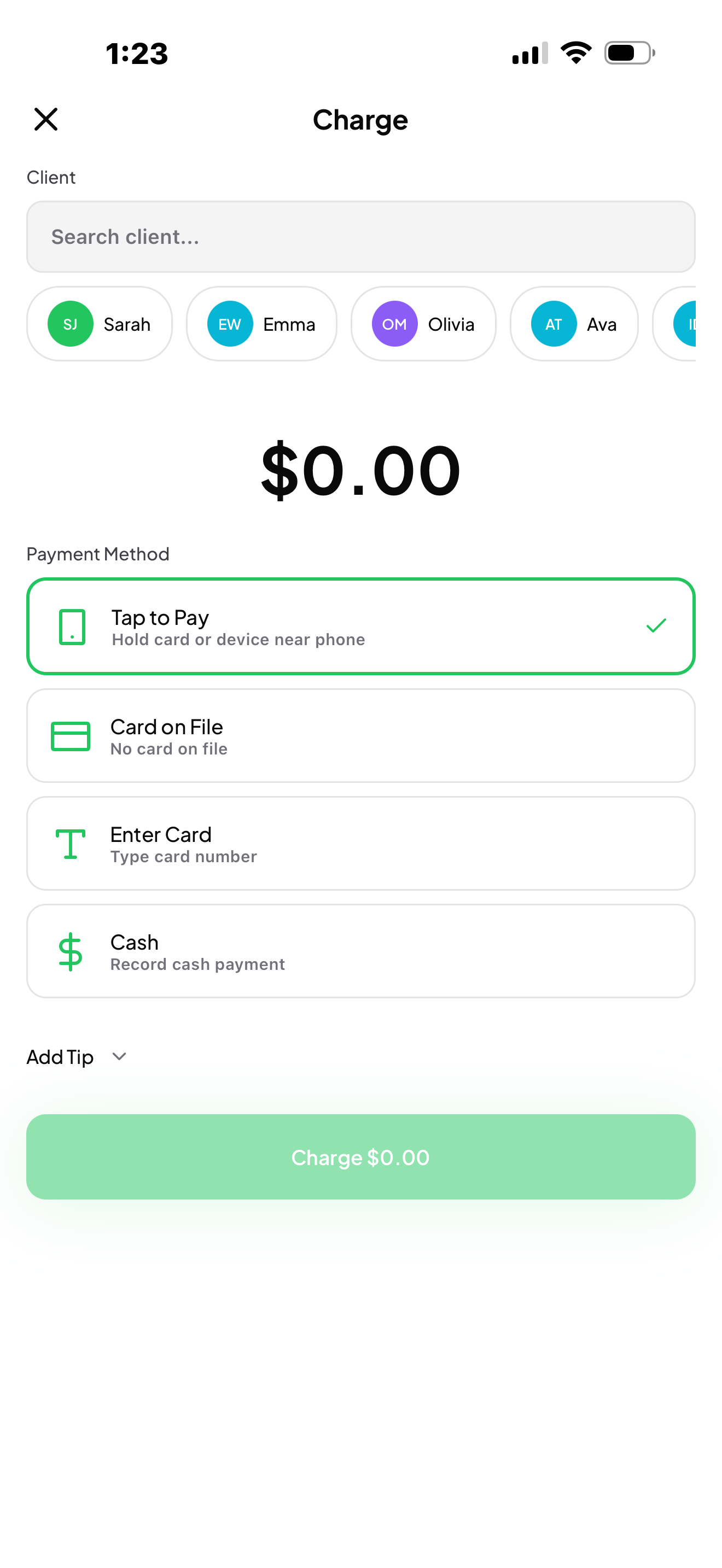 Send clients a secure link to save their card. After their appointment, one tap charges the card on file. Receipt goes out automatically.