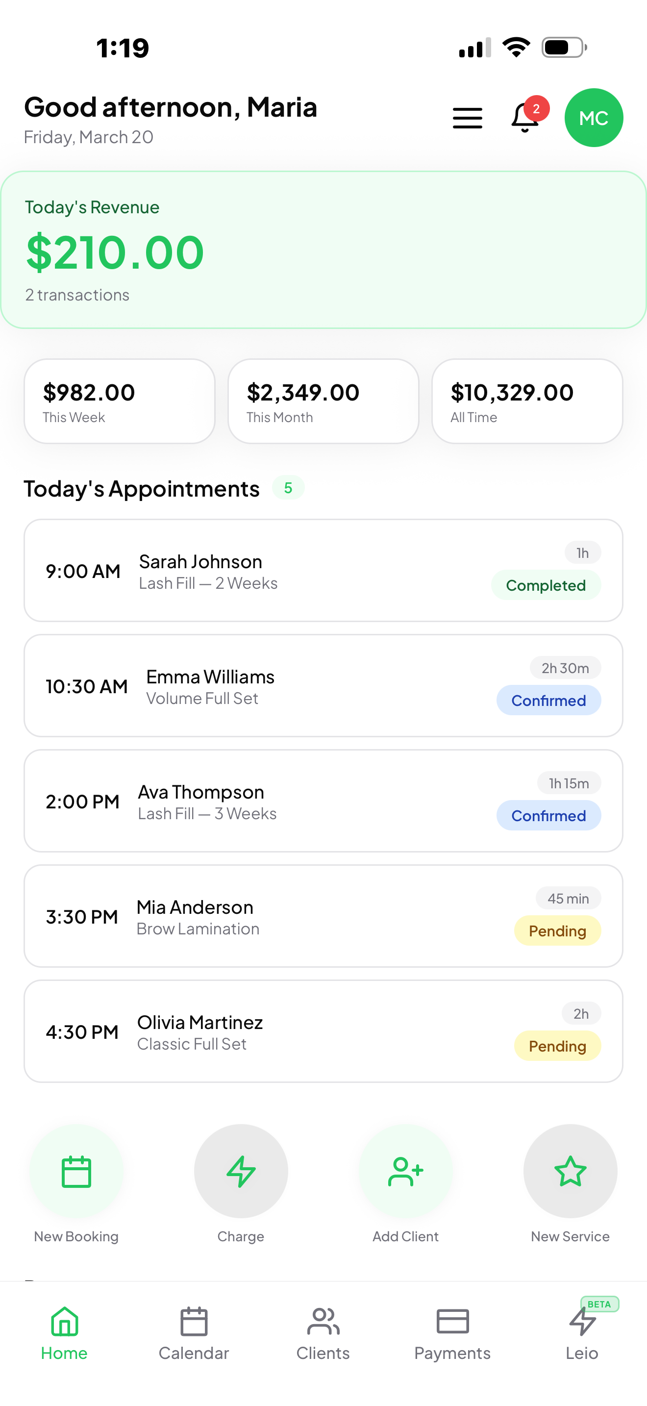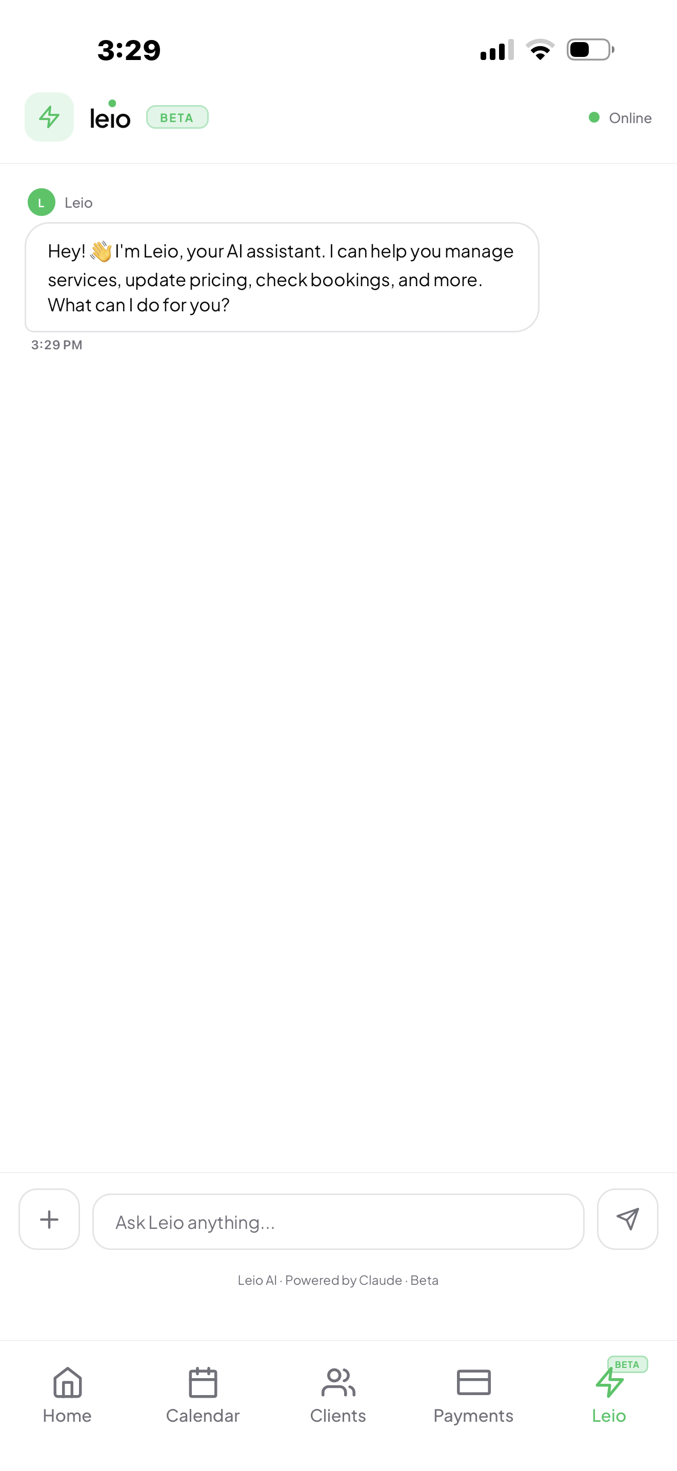 Ask Leio anything. Check your bookings, update pricing, or get a revenue breakdown — all in plain English.